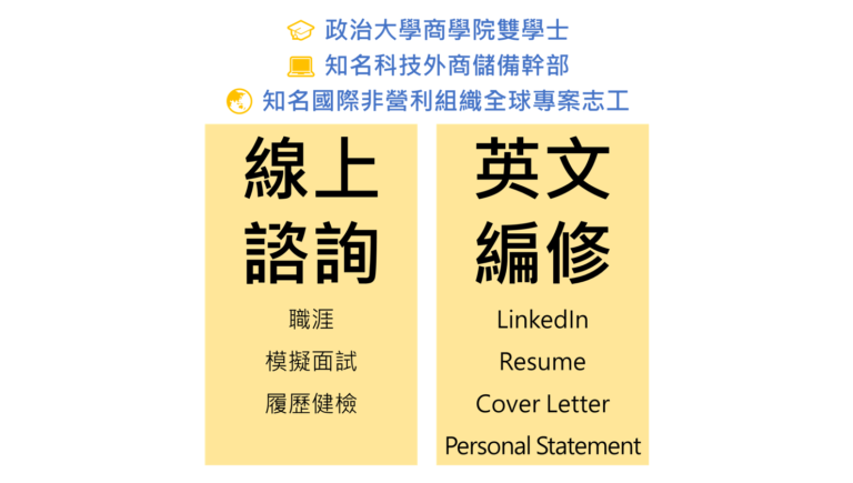 哈囉,我是Alice,希望能透過協助編輯修改你/妳的英文履歷 Resume、LinkedIn Profile、英文求職信 Cover Letter、英文自傳 Personal Statement,幫助你/妳申請上理想的職位或學校喔!