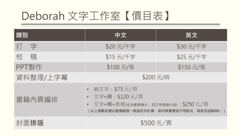 ● 請提供圖、文、初稿樣本或舊有印刷品。● 需自備原始文件,方可進行排版。● 因對稿時間延長將不得計算於後製作時間。● 對稿確認無誤方可進行印刷。 ● 對稿僅供3次改稿,之後將酌收改稿費用。● 可協助Excel VBA資料key-in和製作圖表。 ✦ 排版時間1-3工作天 (不含六日及例假日)
