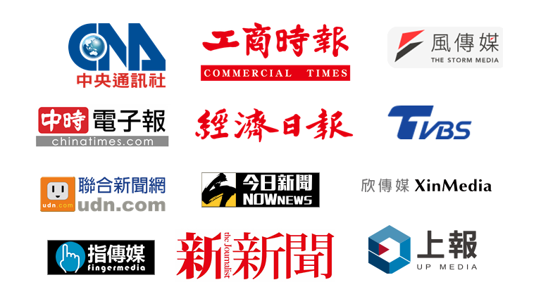 中央社、中時電子報、聯合新聞、工商e網、經濟財經、Today News今日報、台灣時報、新生報、民眾日報、風傳媒、痞客邦、指傳媒、新新聞、北市新聞、世紀新聞、上報、欣傳媒、台灣新聞報、桃園新聞、新頭條、鏡周刊、ETtody
