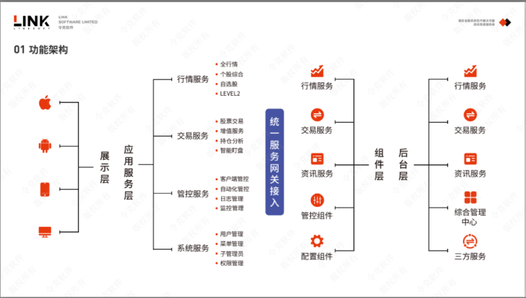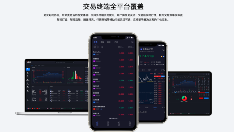 可支持多品類金融產品交易,包括港股、美股、滬深股,等其他市場。我們證券交易系統在國際化金融市場視野及前瞻性的前提下,參照國際投行操作及經驗構建以用戶為中心的業務系統,快速反覆運算、符合現代投資發展趨勢的覈心業務系統,是行業領先的交易終端系統。Websocket實时推送證券市場和交易行情。配備專業的科技開發團隊,FIX API介面服務,實現實时金融市場資訊交換,進行日常交易及運維。另對證券交易所市場情况進行即時監控。有效實現企業級的管理監控,自動預警的智慧型系統,為在多種作業系統和多種庫系統上運行的系統,提高本系統的平臺適應能力,為用戶提供最大程度的平臺選擇性。