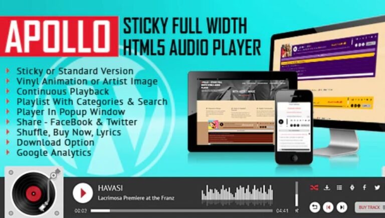 Apollo 全版HTML5 音檔撥放器- Sticky Full Width HTML5 Audio Player是LambertGroup 開發的Wordpress延伸套件工具,與各種主要瀏覽器及手機操作系統相容,多種圖像及影片動畫格式,支援 .mp3 /.ogg 聲音檔特色如下: