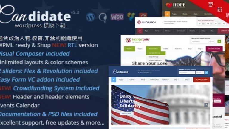 Candidate theme 是 Monkeysan開發,在themeforest.net銷售長紅的wordpress套版,非常適合政治人物/教會/非營利組織等機構建置網站使用.