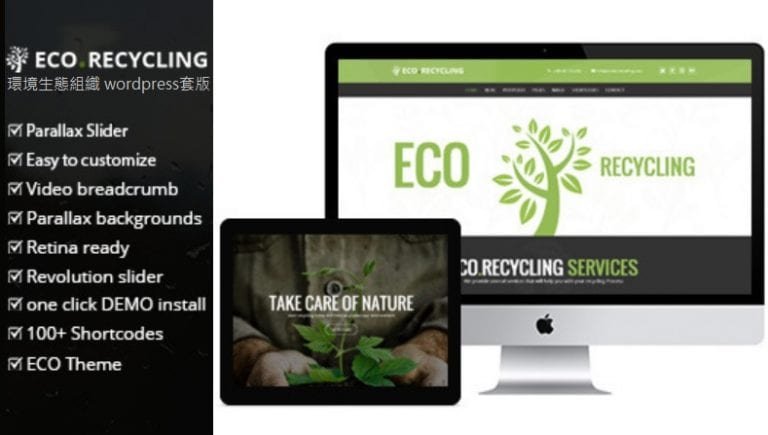 Eco Recycling theme 是 gljivec開發,在themeforest.net銷售長紅的wordpress套版,乾淨簡潔的設計風格,滿足環境保護/生態組織訴求.