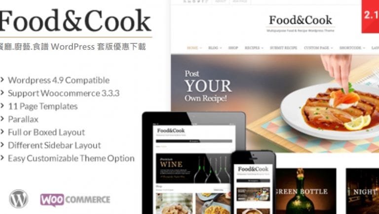 Food & Cook theme 是 Dahz開發,在themeforest.net銷售長紅的wordpress套版,Food & Cook 模版具有簡潔有力的設計,適合各類專業餐廳.廚師.餐飲.食譜網站使用.