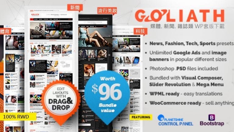 GOLIATH theme 是 MVPThemes開發,在themeforest.net銷售長紅的wordpress套版,GOLIATH 模版具有多元有趣的設計,適合各類產品評論為主的媒體採用.