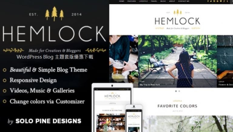 Hemlock是 SoloPine 開發,在themeforest.net銷售長紅的wordpress套版,Hemlock主題套版有簡潔現代的設計,介面功能操作簡易,無論是公司網站,一般個人使用皆可輕鬆完成優異部落格網頁設計.