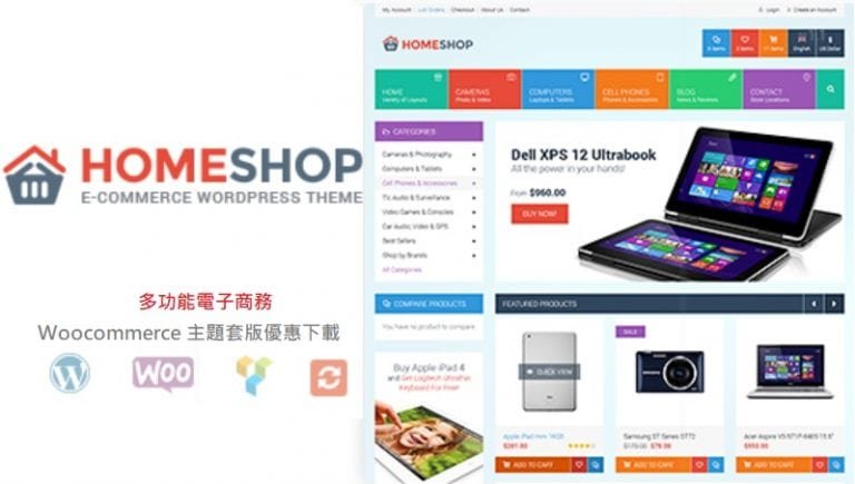 Home Shop theme 是 Monkeysan 開發,在themeforest.net銷售長紅的WooCommerce套版,Home Shop 主題套版設計現代簡潔,有完整購物商城功能,無論各種商品,皆能輕鬆建立流暢電子商務網頁設計.