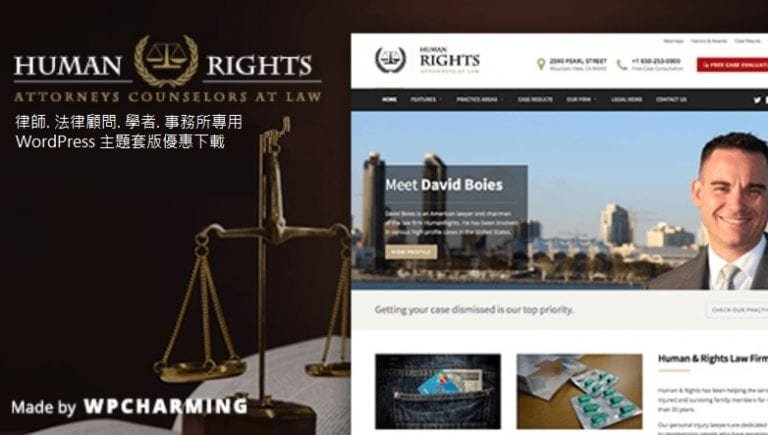 HumanRights  theme WPCharming開發,在themeforest.net銷售長紅的wordpress套版,HumanRights 有專業簡潔的現代設計,非常適合律師,法律顧問,學者,事務所等使用,簡單地完成美麗網頁設計.