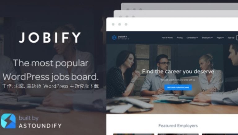 Jobify theme Astoundify開發,在themeforest.net銷售長紅的wordpress套版,Jobify是市面上最容易使用的工作,求職,職缺類網站主題套版,輕鬆建立您專屬的工作搜尋引擎,完成專業實用的網頁設計