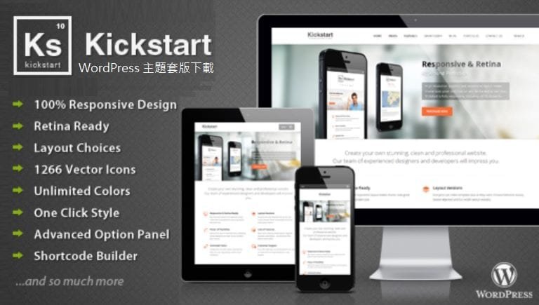 Kickstart theme 是 MNKY開發,在themeforest.net銷售長紅的wordpress套版,Kickstart主題套版有著優異設計,非常簡單入手使用,簡潔又兼具功能齊全,無論是公司網站,一般個人工作室,皆能輕鬆簡單地完成美麗網頁設計.