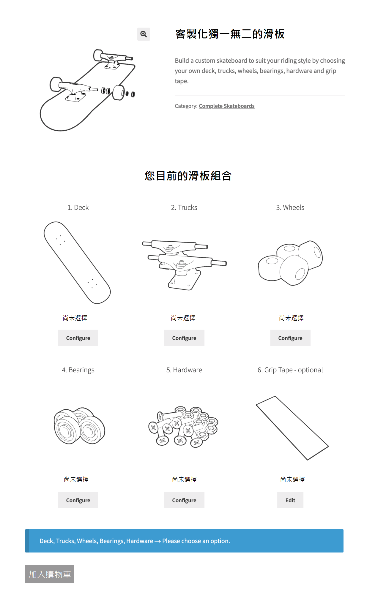 WooCommerce Composite Products 產品組合套件主要適用於多配件組合成的商品,例如電腦,滑板,禮物盒,或客製化的首飾等產業,特色如下: