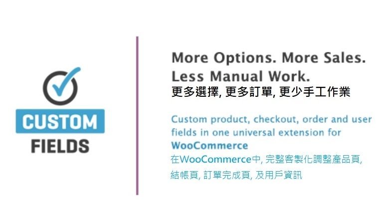 WooCommerce Custom Fields主要功能在於使您輕易客製化商品、結帳頁、訂單完成頁、及用戶資料頁等表格,讓各種資訊能以完整結構方式呈現,特色如下: