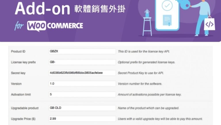 WooCommerce Software Add-on 軟體銷售外掛主要功能在於讓您能在woocommerce商城環境直接管理軟體銷售的金鑰/版本開通,在產品頁就能管理軟體的版本等資訊,…..更多資訊請見官網 連結