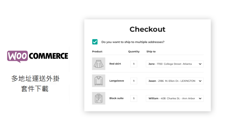 YITH multiple addresses shipping for woocommerce 多地址運送外掛主要功能在於讓網友能在同一張訂單中,購買商品分送給同事/朋友/家人等不同對象,大幅解決網友分批購買的麻煩,加速購買決策速度,提高整體網站轉換率,其他特點如下方: