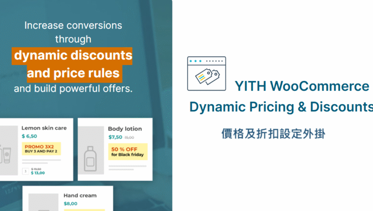 YITH WooCommerce Dynamic Pricing & Discounts 價格及折扣設定外掛專為電商與網站擁有者打造,主要功能在於讓您輕鬆設定各種促銷與加購活動,買一送一、滿額贈、限時優惠一次搞定!有效提升轉單率與客單價,電商網站營收翻倍成長。更多外掛特色請見開發商官網:連結